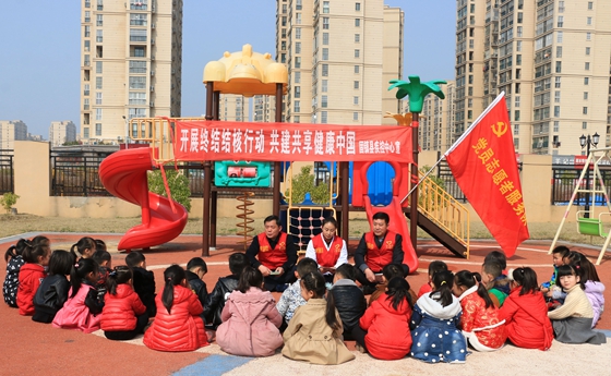固鎮(zhèn)縣疾控中心、城關(guān)鎮(zhèn)衛(wèi)生院黨員志愿者在城關(guān)鎮(zhèn)幼兒園向兒童宣傳健康知識。