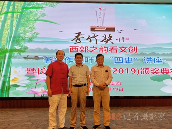 中國作家副主席葉辛(中)與長三角作文大賽總策劃人丁翔、世界華文微型小說研究會會長凌鼎年(左)合影于頒獎典現場(2020年9月19日)