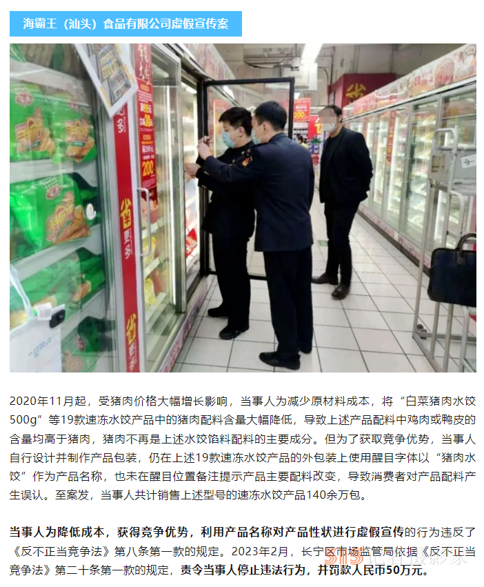 中國網財經1月9日訊(記者 葉加)日前,上海市場監管局官方公眾號曝光數起“2023年反不正當競爭專項執法行動”典型案例,其中海霸王(汕頭)食品有限公司因虛假宣傳案被通報。