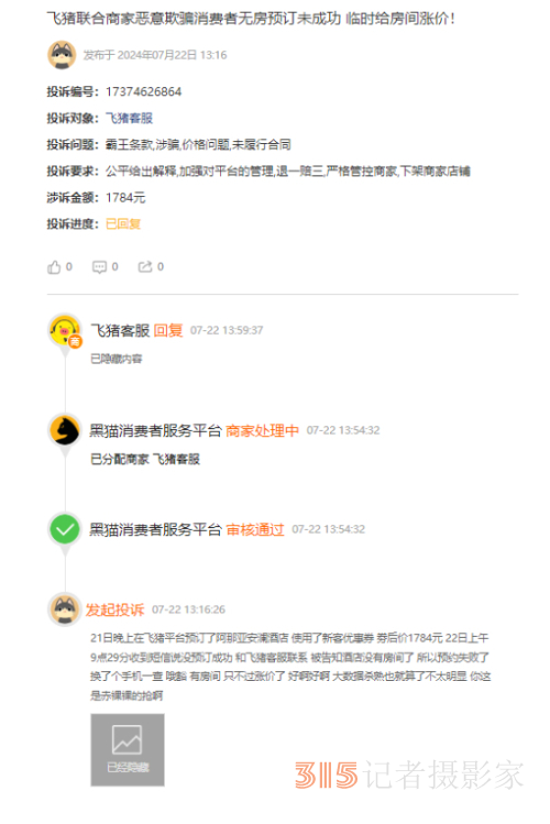 然而,他用妻子的手機賬號再次查詢,發(fā)現(xiàn)酒店房間仍有空余,但價格漲至2203元。為了維護權(quán)益,汪先生在12345市民服務熱線和黑貓投訴等平臺發(fā)起了投訴。