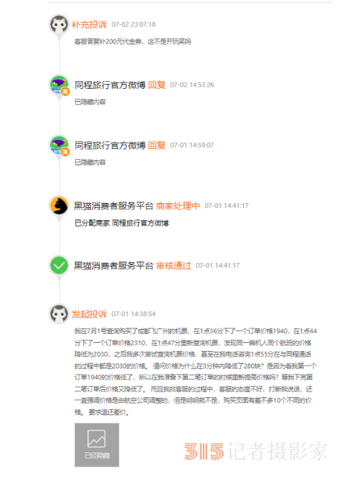 隨后,同程客服以“價格由航空公司調(diào)整”為由拒絕賠付差價,提出給予200元機票代金券作為補償。