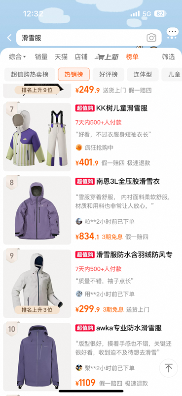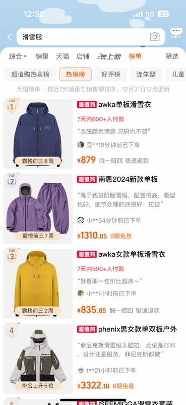 天貓“雙旦”禮遇季期間,國(guó)產(chǎn)品牌ISEE MIGGA成交同比增長(zhǎng)超500%,awka 3L滑雪服單日賣(mài)2000多件。在天貓滑雪服銷(xiāo)量榜(截至2024年12月31日)前10名中,7個(gè)均為國(guó)產(chǎn)品牌。