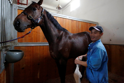 內蒙古萊德馬業有限公司在此次比賽中共派出了16匹馬和7名騎手,正在為馬綁馬腿的騎手陳意就來自這里。據陳意介紹,從2014年開始,他已經是第四次參加中國馬術節的比賽了。此次與他配合的是今年被馬業協會評為 “馬王”的布日古德。布日古德是蒙語,漢文的意思是雄鷹。去年的中國馬術節2000米速度賽馬中,布日古德力壓于謙的“大謙世界”,獲得冠軍,它的身價也是瞬間上升至100萬人民幣。