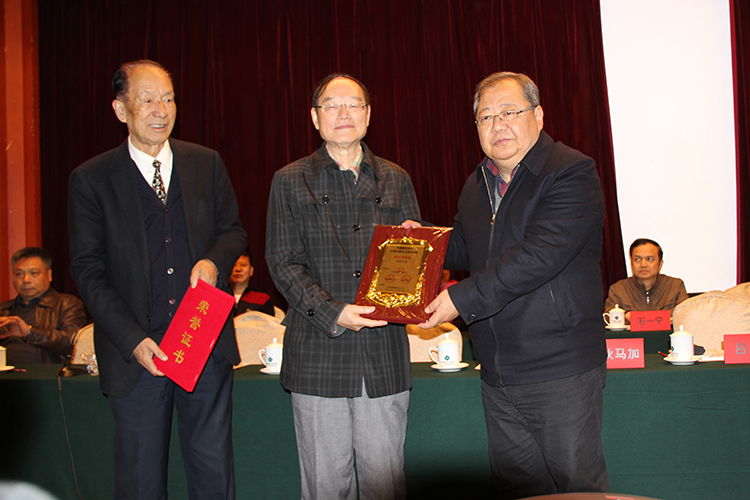 西南大學教授、博士生導師呂進向中國作家協(xié)會副主席、書記處書記,魯迅文學院院長吉狄馬加授獎牌