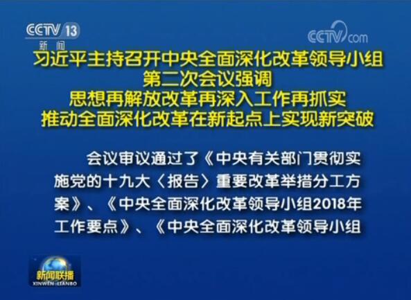 會議審議通過了《中央有關部門貫徹實施黨的十九大〈報告〉重要改革舉措分工方案》、《中央全面深化改革領導小組2018年工作要點》、《中央全面深化改革領導小組2017年工作總結報告》。